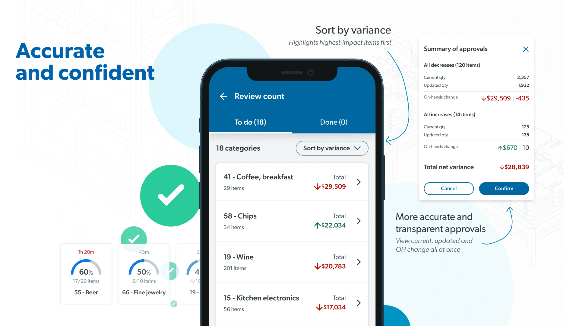 Finalization is now clearer and more accurate, with managers receiving a consolidated summary of all discrepancies and recount outcomes. Each variance includes context from previous steps, reducing guesswork and making approvals faster and more transparent.