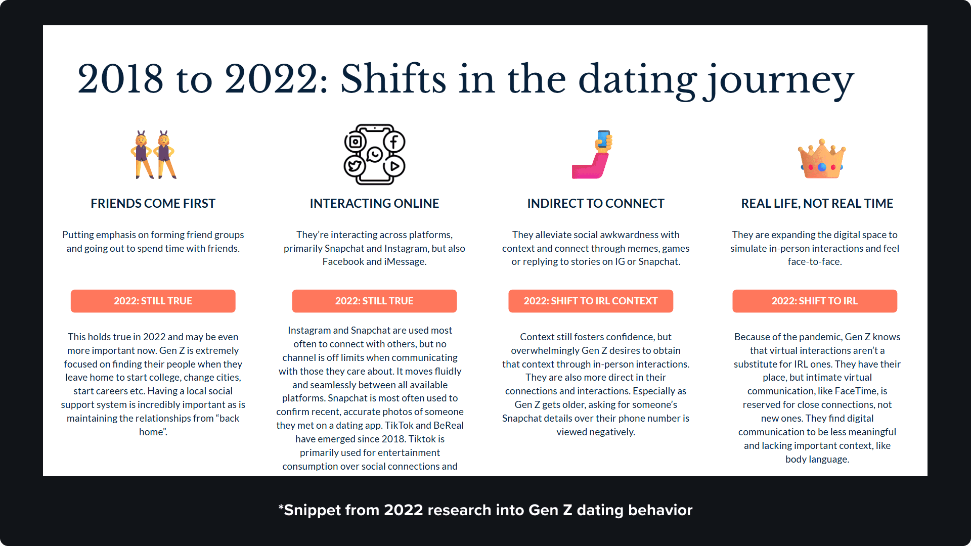 Historically, Tinder’s Explore page struggled with low engagement because it failed to differentiate itself from the core swiping experience. To understand how to pivot, we looked closely at our growing Gen Z user base. Research revealed that this demographic is experiencing digital fatigue and craving "realness." They are eager to transition from endless online interactions to becoming real-world explorers. Most importantly, we discovered that for these users, transitioning quickly to an in-person meetup isn't just a preference, it’s their primary coping mechanism for overcoming online dating anxiety.