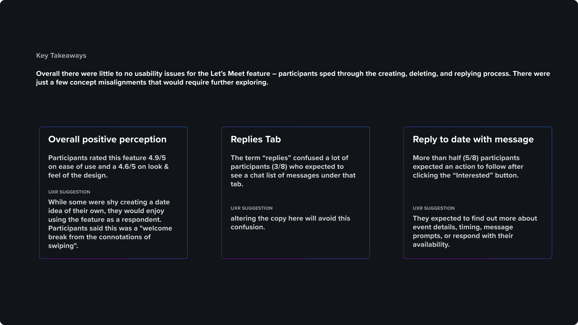 Initial user testing strongly validated the "Let's Meet" concept, with participants praising the experience as a "welcome break from the connotations of swiping." Beyond our primary goals, the test showed a significant increase in the swipe right rate (aka liking) among women. This was a historically difficult metric to improve for any Tinder feature so it was a very pleasant surprise for the team.