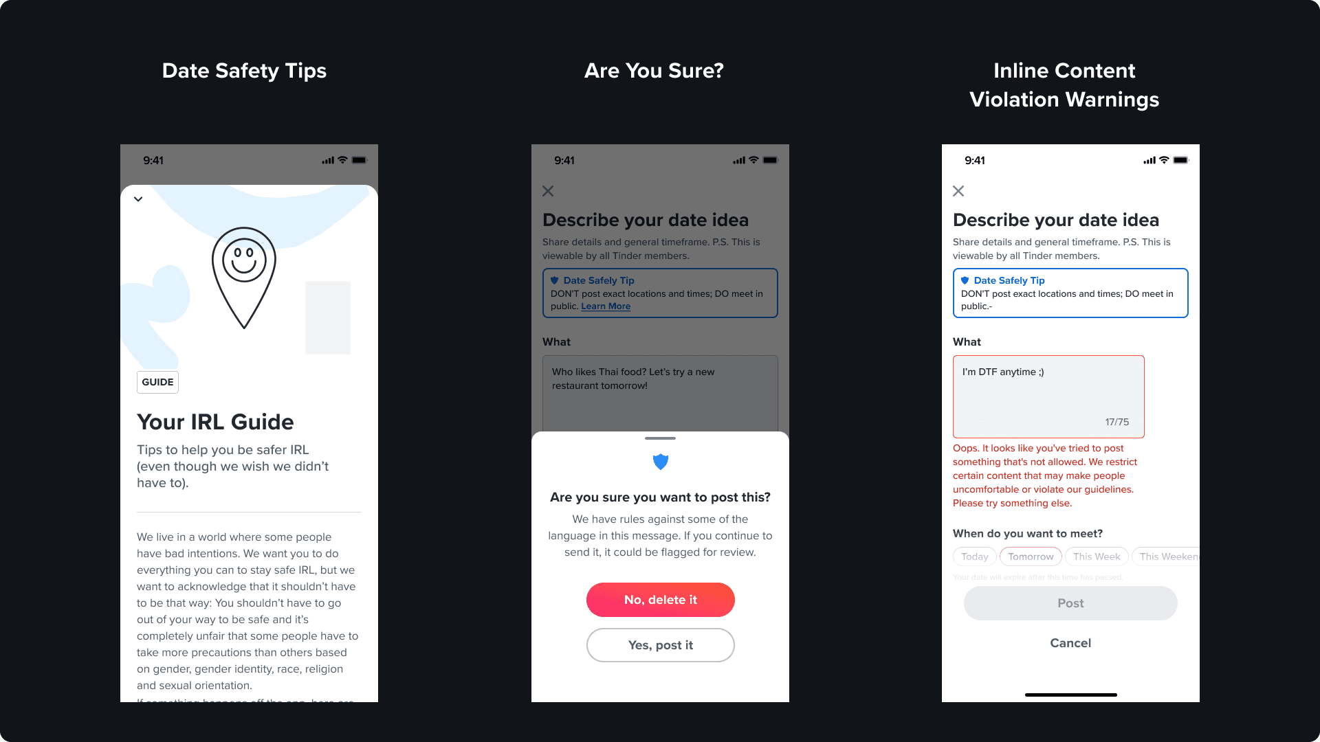 Because the core goal of "Let's Meet" is to accelerate the transition from online matching to in-person meetups, protecting our users in the physical world was paramount. Throughout the entire design and development cycle, we worked with Tinder’s Trust & Safety team. By actively collaborating with security experts, we were able to embed proactive safety checks and guardrails directly into the flow, ensuring that reducing friction for real-world connections never came at the expense of user well-being.
